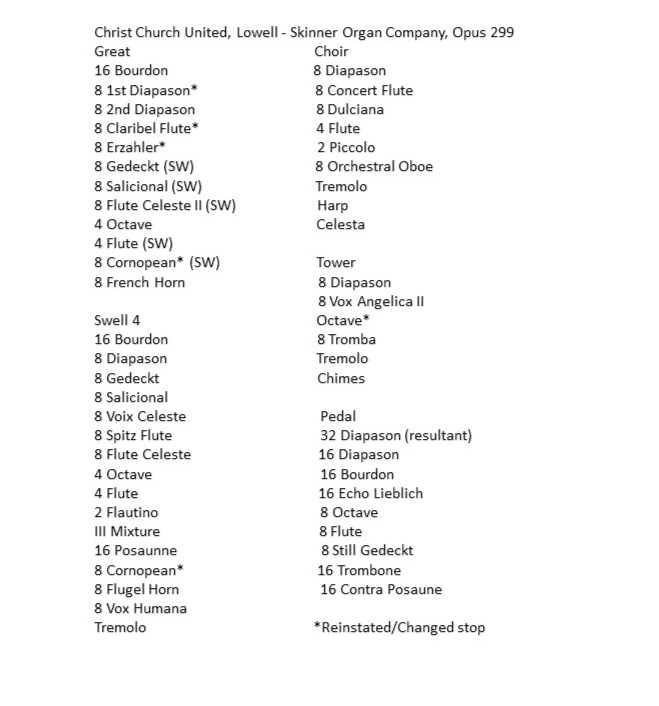 Opus 299 is a remarkable instrument by American builder E.M. Skinner, unique in its tonal quality, placement throughout the church building, and accessability to the urban community of Lowell. "In one sense, this instrument is priceless. It is no exaggeration to say that Skinner standards will never be met again. The materials and craftsmanship simply do not exist today, (Joseph Rotella)."